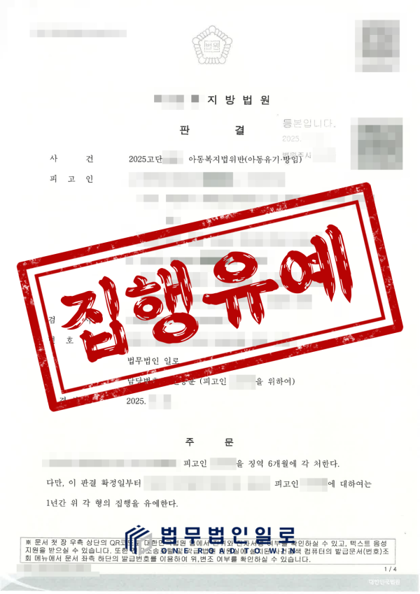 이에 다행히도 재판부는 의뢰인의 아동복지법위반(아동유기·방임) 혐의에 대해 ‘집행유예’ 판결을 내려주었습니다.