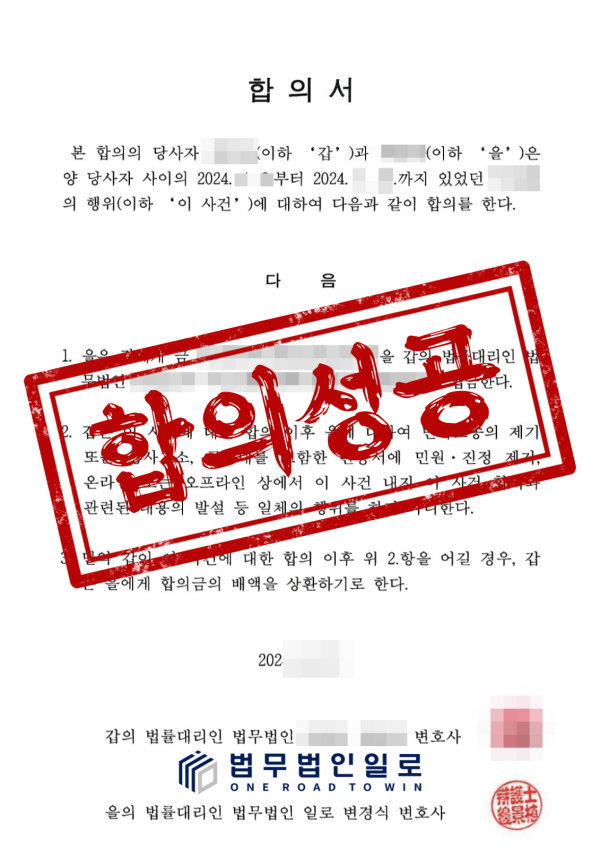 이에 다행히도 의뢰인의 통신매체이용음란 혐의에 대한 사건화전합의를 진행하여 형사 고소 진행 없이 사건을 마무리할 수 있었습니다.